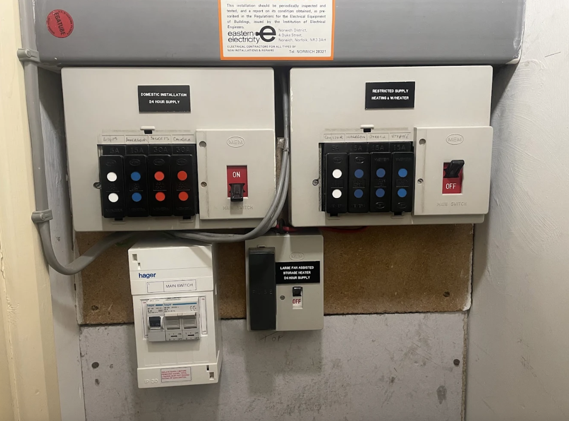 I still see a lot of rewireable fuseboards in Norwich homes — those little wire cartridges that have to be replaced when they blow. They’re not unsafe by themselves, but they offer much less protection than current standards.